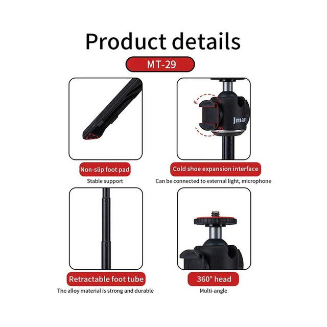 Jmary MT-29 মিনি ট্রাইপডটি বিশেষ করে ভ্লগার, ফটোগ্রাফার এবং ভ্রমণকারীদের জন্য ডিজাইন করা হয়েছে। এর হালকা ওজন এবং ছোট আকার এটিকে সহজে বহনযোগ্য করে তোলে, আর এর মজবুত নির্মাণ নিশ্চিত করে আপনার ক্যামেরা বা ফোনকে দেবে দারুণ স্টেবিলিটি। এটি প্রফেশনাল ভিডিও শুটিং থেকে শুরু করে দৈনন্দিন সেলফি তোলার জন্যও উপযুক্ত।